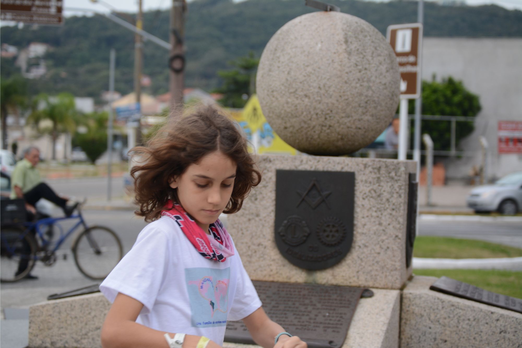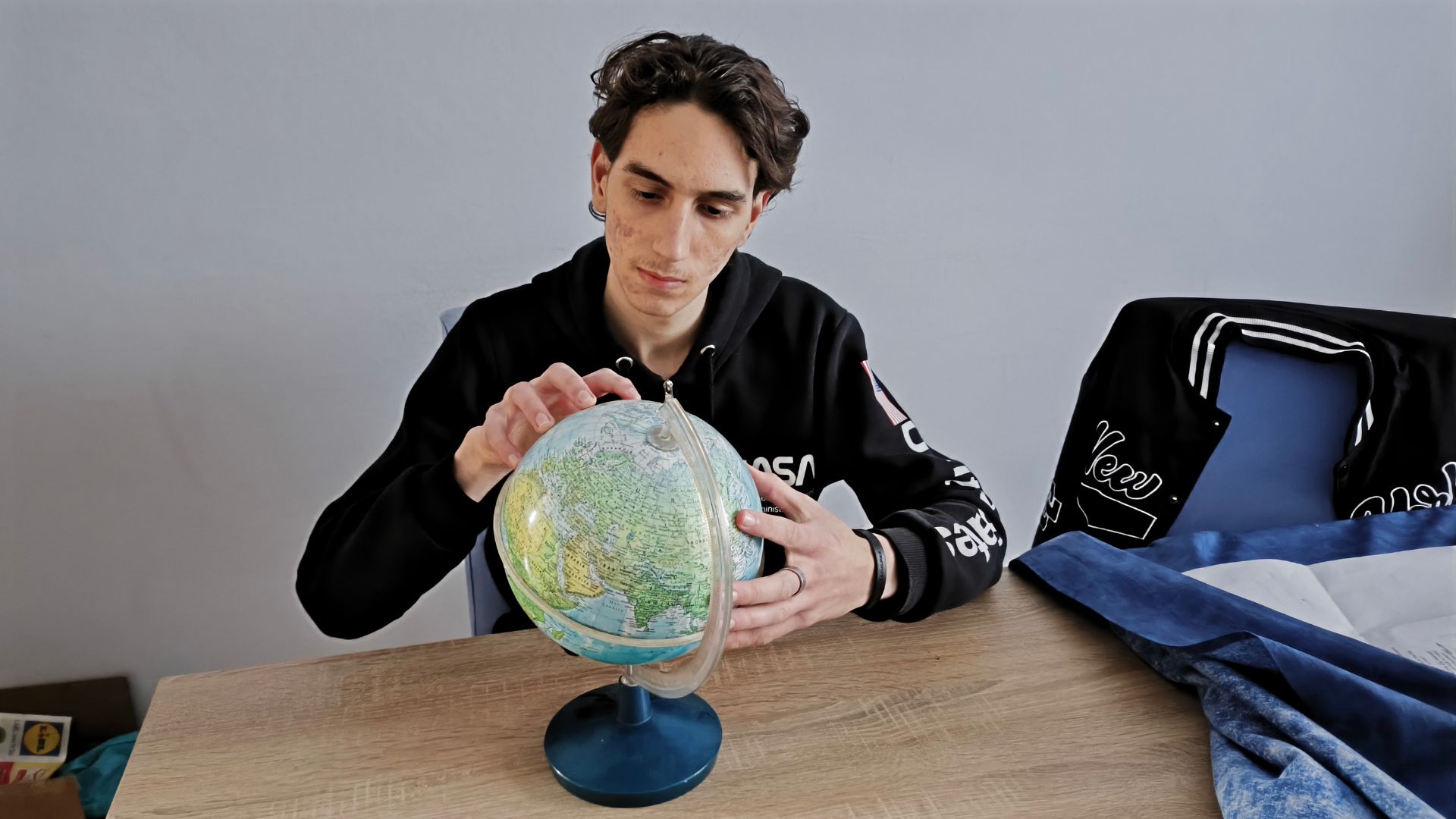 Estudando geografia com o globo durante a viagem.